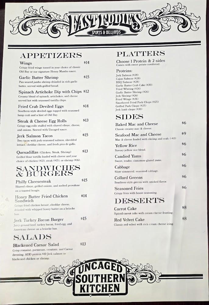 Fast Eddie's menu showcases traditional American favorites with about 37 dishes. Highlights include crispy chicken wings, hearty burgers, and BBQ ribs. Specialties like seafood platters and pasta dishes satisfy diverse tastes.